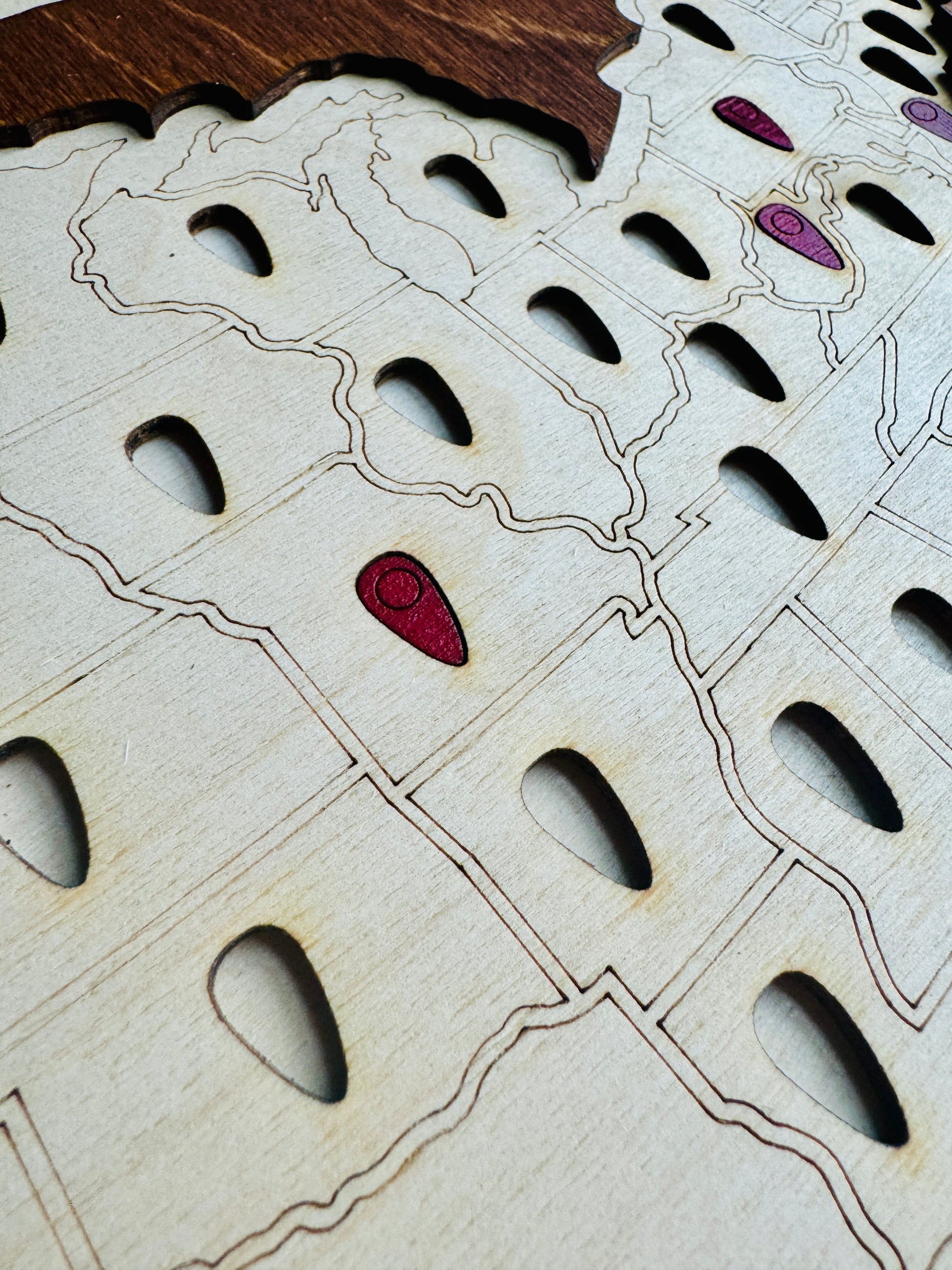 Document your travel journey and decorate your space with our handcrafted wooden United States travel map. This 12” x 18” decorative wall art is made by a small family-owned workshop in Missouri, using premium Baltic birch wood for a rustic and durable finish. Each map includes wooden pins that fit perfectly into pre-cut state slots, allowing you to track where you’ve been or plan future adventures. Designed to complement any interior style, this map serves as both a travel log and a stylish home accent. Whether you’re a road trip enthusiast, a couple mapping shared adventures, or someone looking for a meaningful gift, this travel map is a memorable way to celebrate your wanderlust.