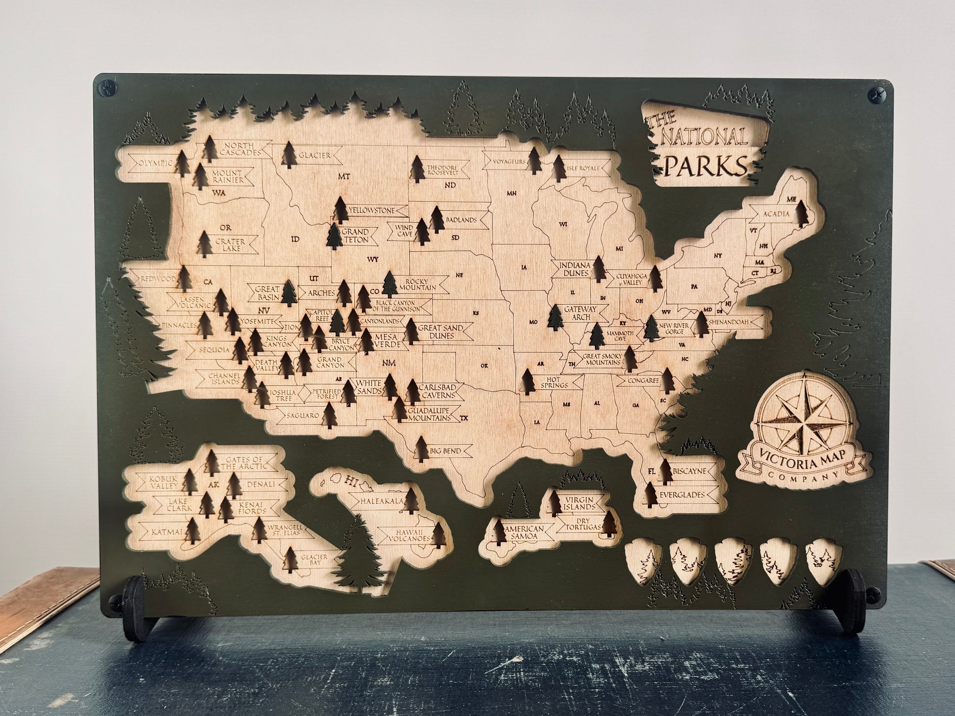 Track Your National Park Adventures in Style Celebrate your journey through all 63 U.S. national parks with our handcrafted wooden national park tracker map. Made from premium Baltic birch wood, this interactive map is a creative and beautiful way to display the parks you’ve visited—perfect for hikers, RV travelers, and outdoor lovers alike. Interactive Travel Decor for Nature Lovers Simply insert the included wooden trees into the pre-cut holes of the parks you’ve explored. Each map includes accurate park locations, a compass rose, and a rustic design that doubles as wall art for your home, cabin, or camper. The Perfect Gift for Adventurers Whether you’re looking for a national park gift, a travel memento, or a unique piece of wall decor, our USA national park map is a must-have. It makes a thoughtful present for birthdays, anniversaries, retirements, or holidays for any traveler or national park enthusiast. Product Highlights: Covers all 63 U.S. national parks Made from durable, high-quality Baltic birch wood Includes wooden tree markers to track your visits Easy to mount or display with included stand Designed and made in the USA, by a family owned business. Start tracking your travels and inspire your next adventure with this one-of-a-kind national park map!